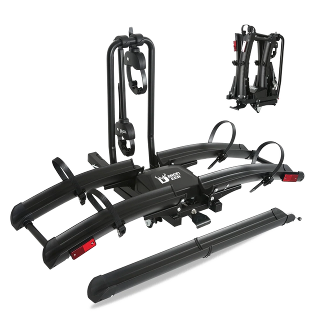 Designed for convenience and security, it features a retractable loading ramp, an anti-wobble system for stable travel, integrated locking for theft protection, and a tilt function that allows easy trunk access without removing the rack. Compatible with standard 2” hitch receivers, the Iron Pro Hitch 2 is ready to use straight out of the box with no assembly required. Safe, stable, and versatile, it’s built to support every ride.