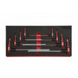 The 8-piece SAE T-handle ball hex wrench set includes the following SAE sizes: 5/64", 3/32", 1/8", 5/32", 3/16", 1/4", 5/16", and 3/8". Each wrench features a dual-end design, with a ball end on the long shaft and a standard hex end on the short shaft. The T-handle design provides enhanced grip and increased turning power. All wrenches are secured in a 1/3 drawer EVA foam tool storage solution insert for organized and accessible storage.