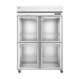 The R2A-HG refrigerator is constructed with a stainless steel exterior (front and sides) and a matching stainless interior for superior sanitation and resilience. It includes six epoxy-coated wire shelves for flexible storage and four half-height, hinged glass doors that provide convenient access. Four 4-inch heavy-duty casters (two locking) ensure both mobility and stability.