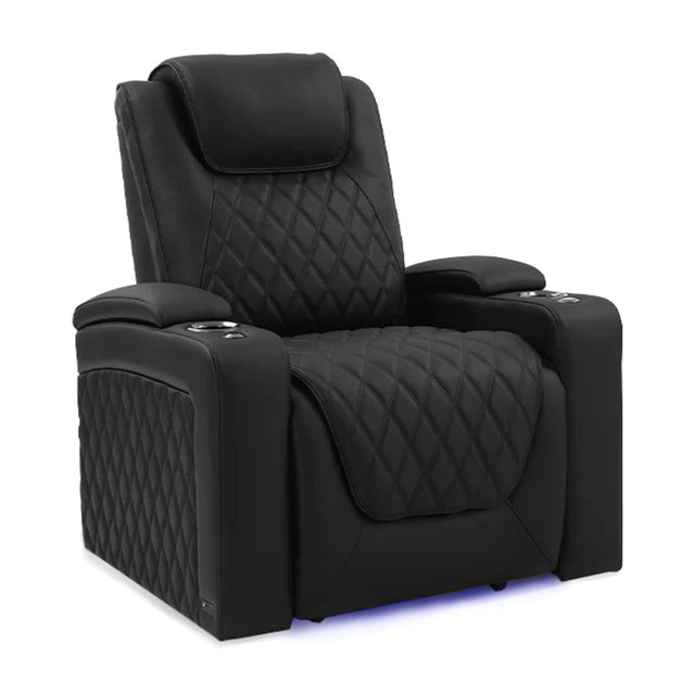 • Fall into the lap of luxury with the Oslo Luxury. Lending itself to the masterful movie maven or seasoned audiophile, the Oslo will take you to new heights of enjoying your chosen entertainment. The timeless double diamond french stitching inlaid to the matte Semi-Aniline Italian Nappa Leather 20000 exudes luxury in any space it is placed into. Ensuring no detail was left behind… you can expect to experience a quiet motorized headrest, lumbar and recline. To truly make the Oslo fit into any aesthetic, 7 cycle RGB LED lights illuminate the cup holders and base of each seat. Coming equipped with an unobtrusive controller panel, USB-A and USB-C charging ports for all devices.